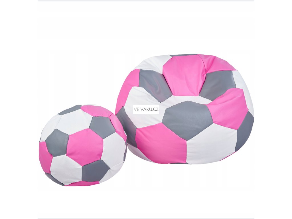 Sedací vak Fotbalový míč XXXXL 100 cm + podnožník – eko-kůže bílo- šedo-růžový