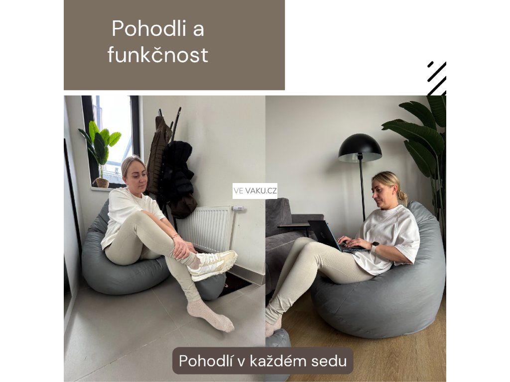 Všechny naše pouffy šijeme pomocí jedněch z nejlepších nití na polském trhu. To zaručuje trvanlivost po mnoho let.Náš vak je určena pro dospělé a teenagery, což neznamená, že je dětem nepohodlná – právě naopak. Jeho rozměry jsou 95 cm x 95 cm x 120 cm. Docela velký, nemyslíte? :) Jeho barvy jsou velmi univerzální. Jsou vhodné do jakéhokoli typu interiéru a věku uživatele. Každý si najde něco pro sebe. Naše vaky snadno se udržují v čistotě. Nevyžadují použití zvláštních detergentov. Pokud se zašpiní, stačí jej otřít vlhkým hadříkem nebo houbičkou s trochou prostředku na mytí nádobí. Není třeba se bát záhybů na taburet. Všechny zmizí samy při sezení.